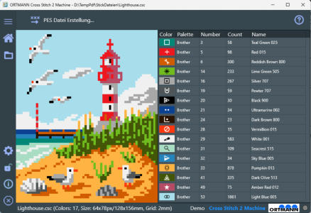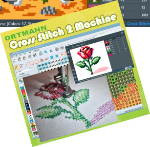 1. With our popular ORTMANN Cross Stitch Designer ©, you can easily create custom cross-stitch patterns from your own photos – or simply paint and design them yourself. 2. Then, with ORTMANN Cross Stitch 2 Machine ©, transform your design into a stitch-optimized embroidery file (PES, JEF, VP3) ready for your machine. Supported formats and brands: Brother, BabyLock, Janome, Elna, Viking, Husqvarna, Pfaff, Singer, and many more (including Bernina via your machine’s import function). Powerful Features at Your Fingertips: Authentic full cross stitches (stitched like true crosses) Quarter crosses & backstitching for fine detail Specialty stitches: Algerian Eyes, Rhodes, French Knots Works with images of any size – large designs are automatically split into multiple hoop sections and stitched together seamlessly Up to 64 colors per design Use any color palette you like, independent of machine brand (e.g., Madeira Rayon Machine palette) Tile guides: optional helper lines for joining multiple sections Automatic stitch splitting for overly long stitches Adjustable shrinkage & distortion compensation Cross sizes from 1.5 mm to 5.0 mmSchrumpfungs-/Verzugsausgleich einstellbar. True crosses without a center stitch. Here is a close-up with 2 mm crosses: Algerian Eye: Rhodes: French Knot: Create amazing images with AI, use beautiful photos, or paint your own designs with ORTMANN Cross Stitch Designer. With just a few clicks, you will have a PES, JEF or VP3 file for embroidery machines. We are currently working on more new thread palettes, especially for embroidery threads: the Madeira Rayon Machine series with 140 colors is ready, as well as a Brother palette with 64 colors. We are happy to send them to you by email. In the near future, these new palettes will also be included directly with an update. Of course, you can also use any other palette of your choice.